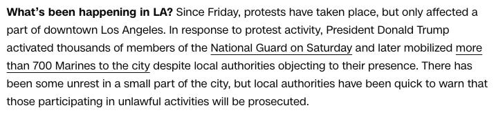 But there is also another message in play this time around: most of LA is all good because the protests are only in a “part of” downtown. Here’s CNN telling us “what’s been happening.”