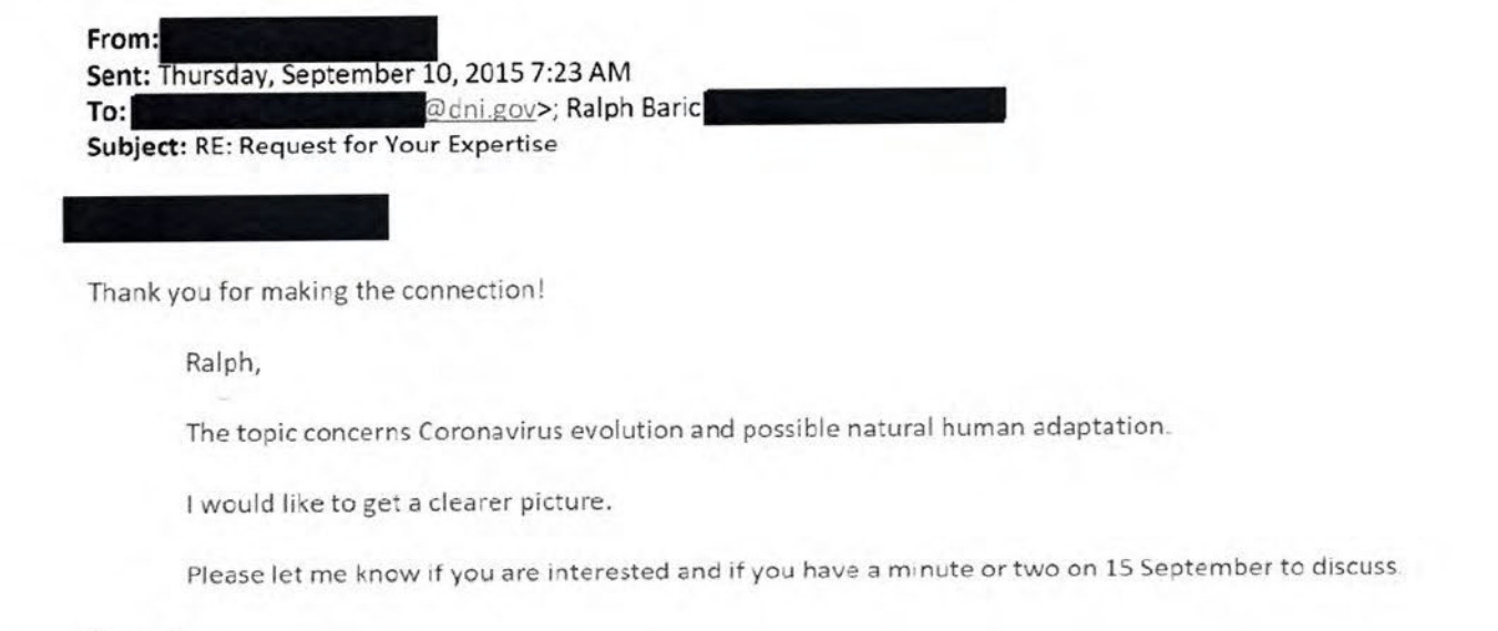 The email exchange with the subject line “Request for Your Expertise” shows an unnamed government official with a CIA-affiliated email address pitching a “possible project” to Baric relating to “[c]oronavirus evolution and possible natural human adaptation.”