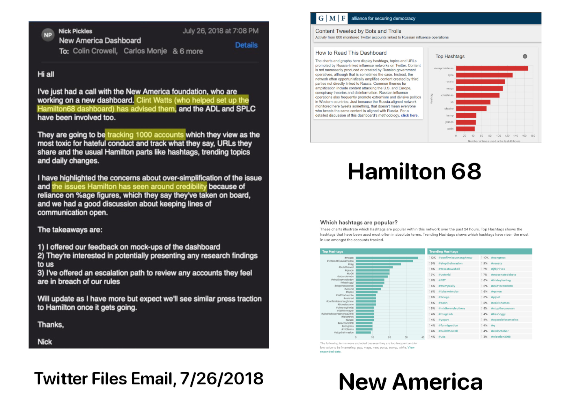 Absent this email, in which Nick Pickles explains that in the call to New America he “highlighted the concerns… around credibility” that came up with Hamilton 68’s Russian-influence-spotting project, the public would have no idea that Hamilton had a domestic-facing relative. A quick glance at the respective products, however, shows that the two organizations were using basically identical techniques (New America has declined to comment publicly on this issue):