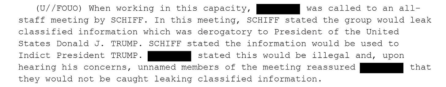 When working in this capacity, [redacted] was called to an all-staff meeting by SCHIFF. In this meeting, SCHIFF stated the group would leak classified information which was derogatory to President of the United States DONALD J. TRUMP. SCHIFF stated the information would be used to indict President TRUMP.