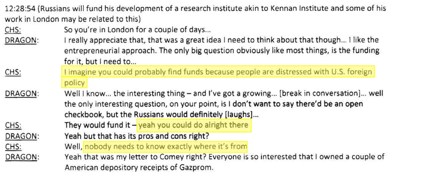 Stefan Halper, another FBI asset, nudged Trumpworld figures like Carter Page with provocative suggestions, like one to seek Russian funding: “I imagine you could probably find funds” and “you could do alright there” and my favorite, “Nobody needs to know exactly where it’s from”: