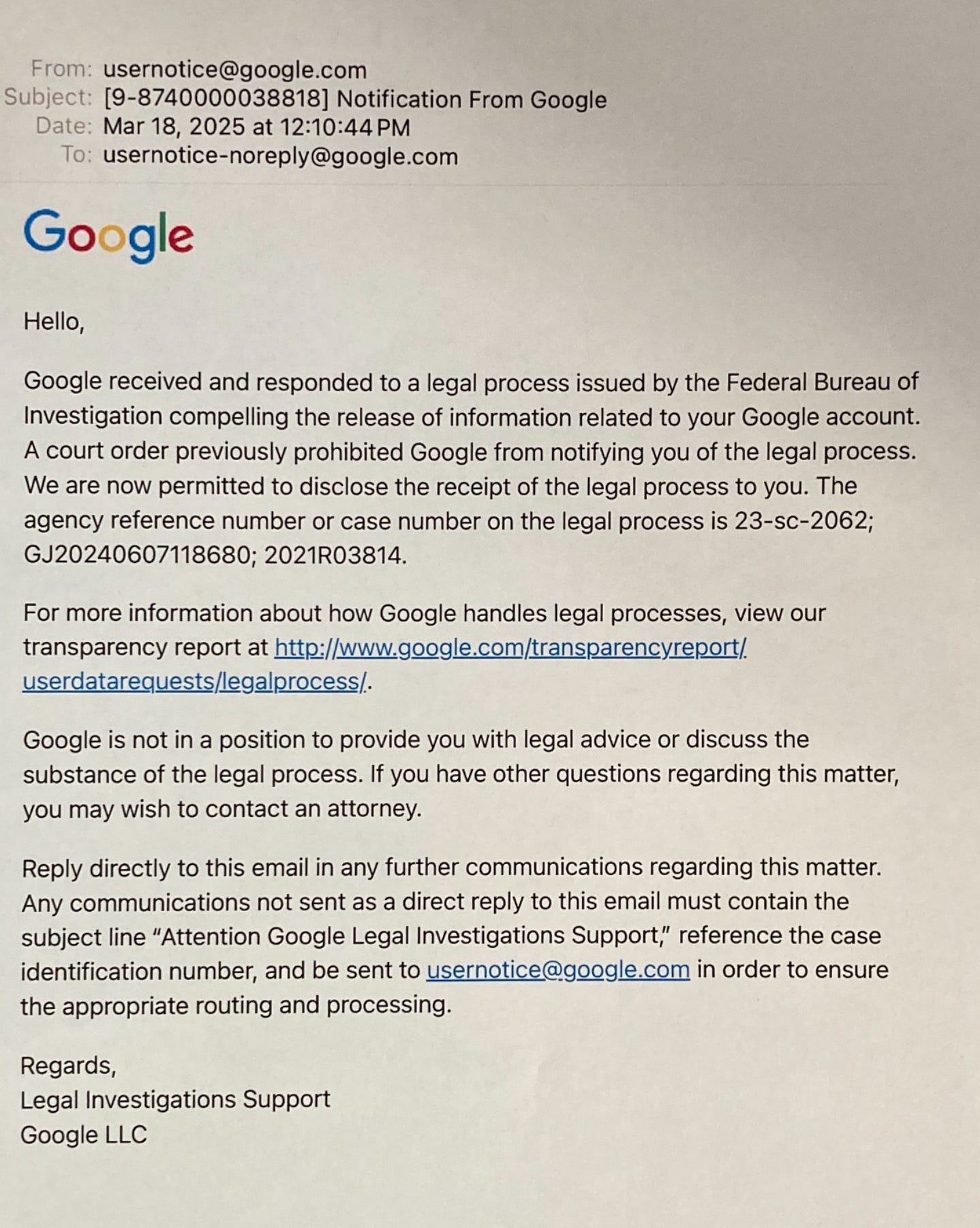 Caputo’s notice read, saying, “Hello, Google received and responded to a legal process issued by the Federal Bureau of Investigation”: