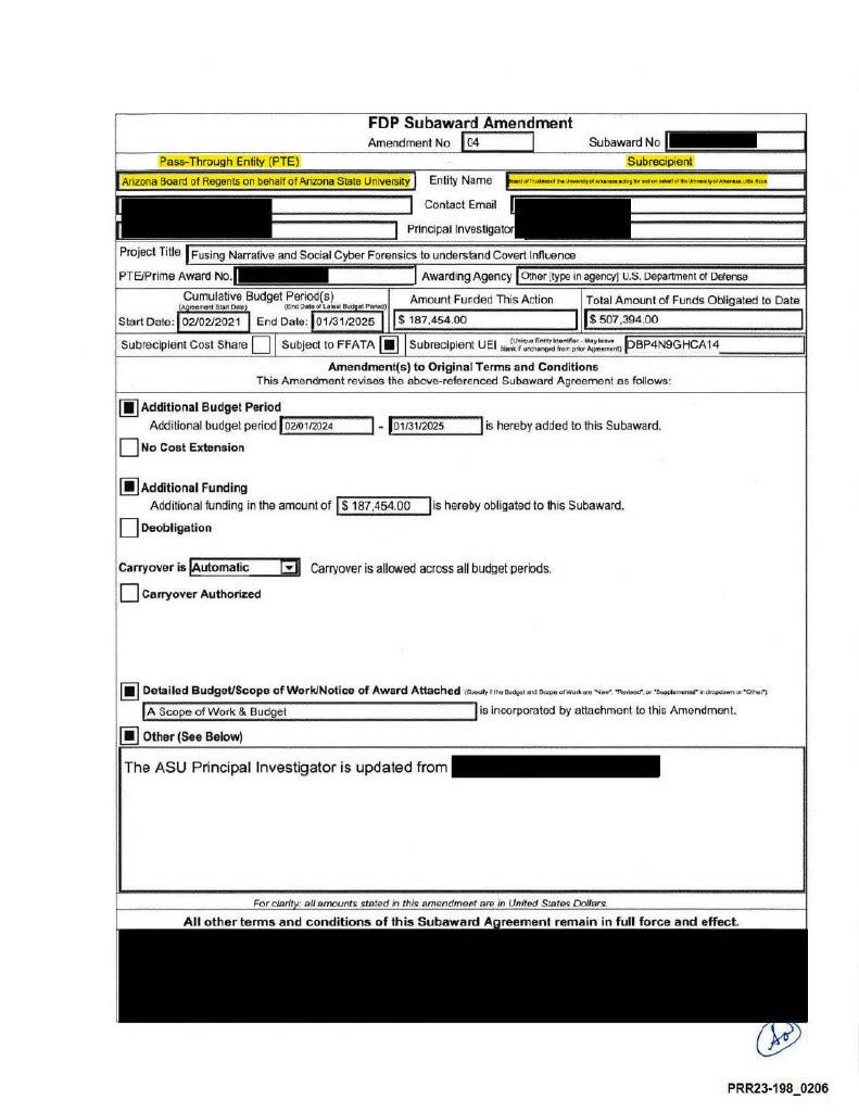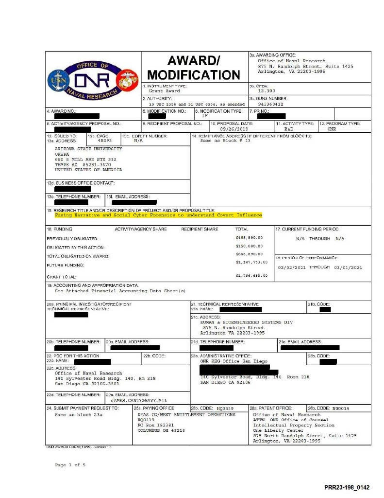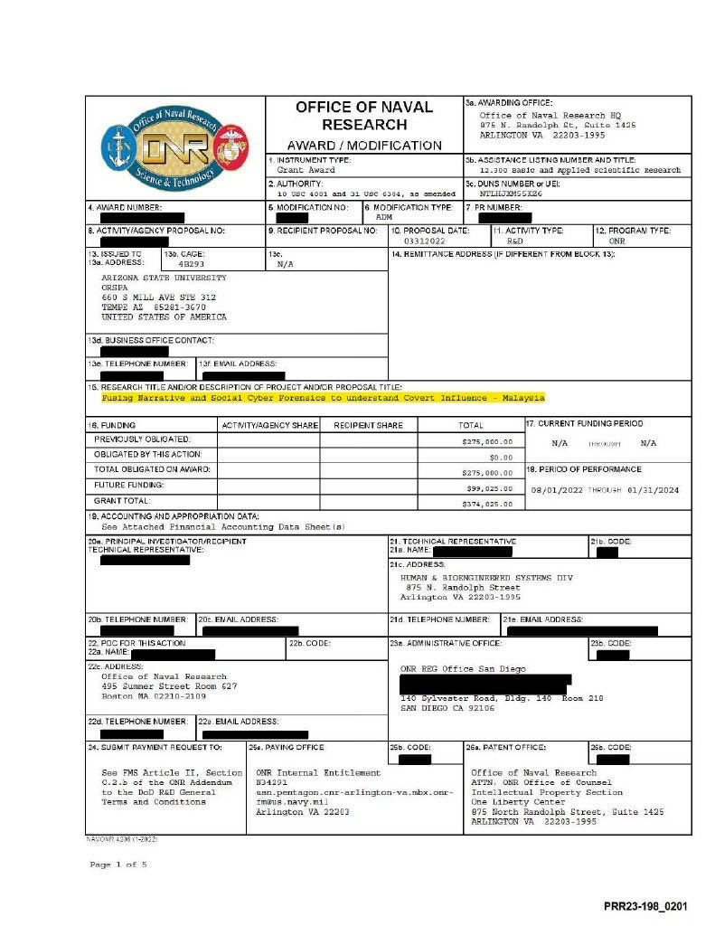 ASU also held a contract with the Office of Naval Research. However, this project, titled “Fusing Narrative and Social Cyber Forensics to Understand Covert Influence,” actually appears to have an international mandate. Its goal is to study the rise of pro-China narratives in East and Southeast Asia, with a focus on Indonesia and the Philippines. Interestingly enough, this proposal comes with a subaward amendment that lists ASU as a pass-through entity and the University of Arkansas at Little Rock as a subrecipient.