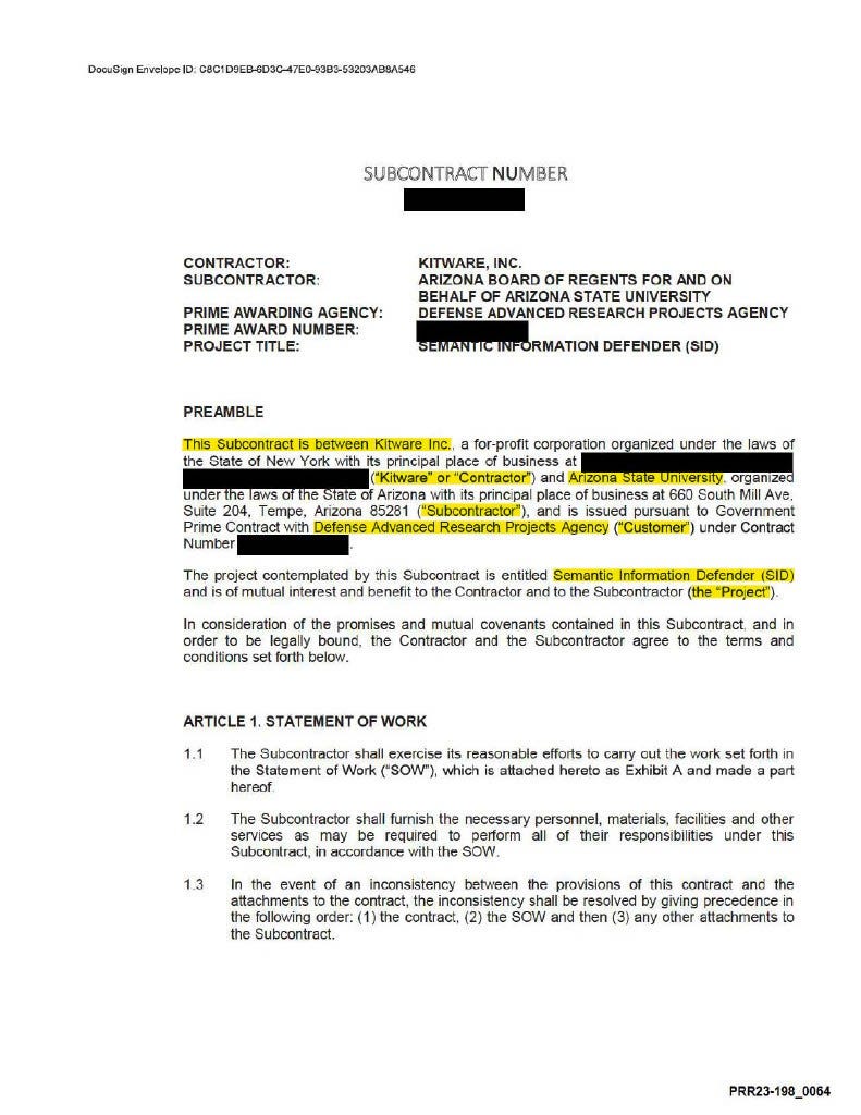 On page 37, you’ll find ASU’s subcontract agreement with Kitware.