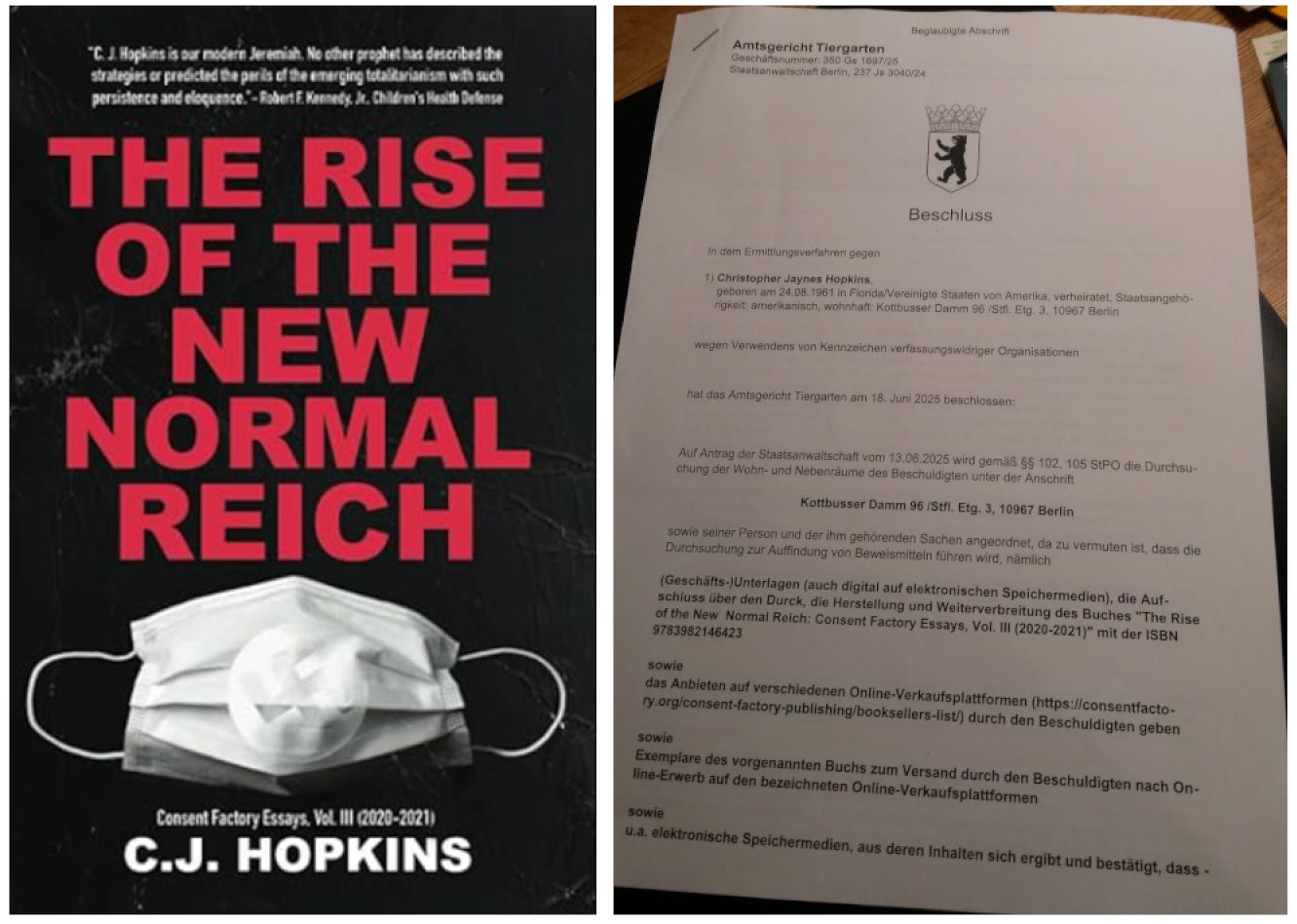 On November 26th, three armed police officers in Berlin showed up at the door of American playwright and author C.J. Hopkins brandishing a search warrant. Having already charged and issued a “punishment order” to Hopkins two summers ago essentially over the satirical use of a swastika on the cover of his book The Rise of the New Normal Reich — it’s in a white-on-white medical mask, mocking pandemic authorities — officials returned with a new theory. After questioning him and his wife, they searched the place for evidence that Hopkins is indeed the publisher of his book and the operator of his Consent Factory blog, where the book is promoted.
