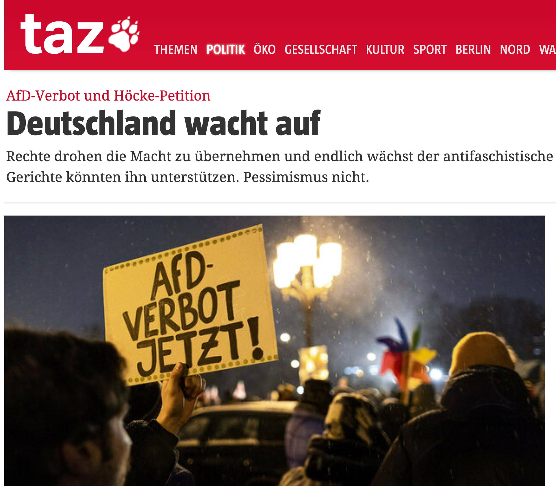 The phrase Deutschland wacht auf recalled a line from the second stanza of the “Sturmlied” anthem, so Bolz essentially was raided for pointing out someone else’s maladroit use of Nazi verbiage. According to Die Welt, police told Bolz to “be more careful in the future” mit der joke-machen. Taz defended Bolz and, humorously, changed its headline.