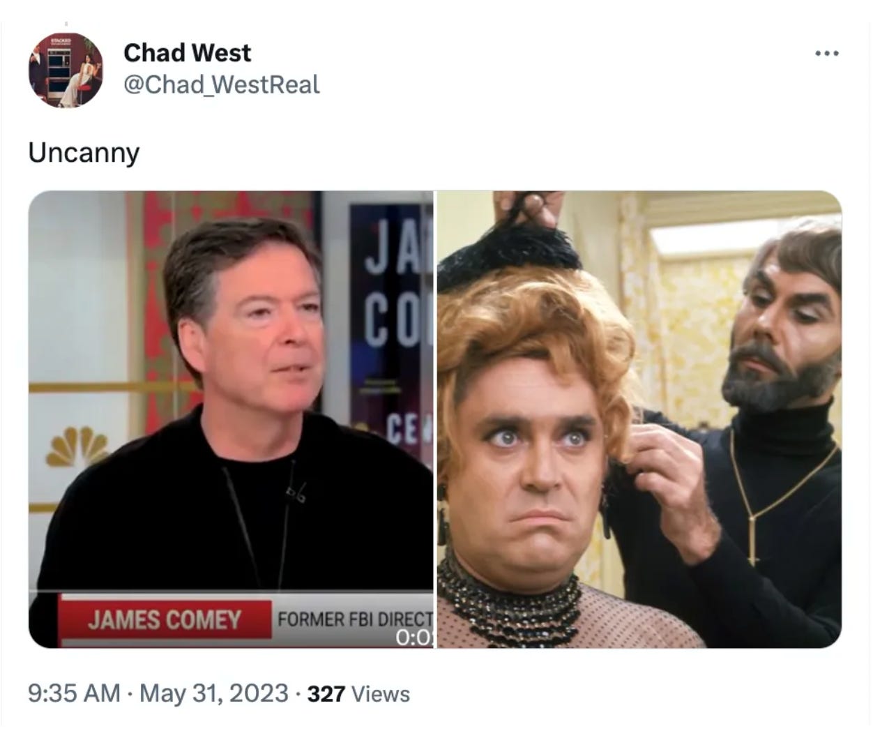 Comey came on set dressed in a sheer black jumper that recalled an Austin Powers extra or the after-hours garb of Arthur Miller or Saul Bellow, signaling his new persona as the author of a mystery novel called Central Park West.
