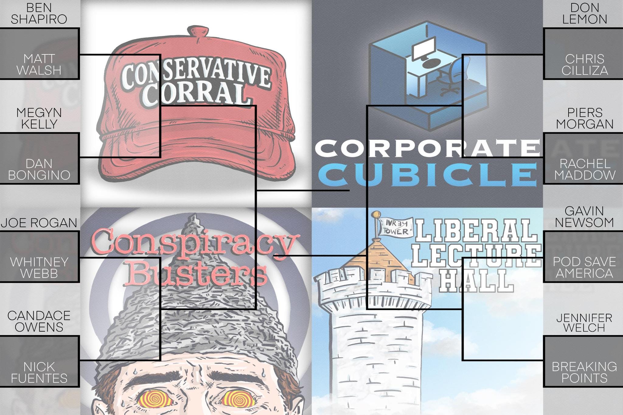 Welcome to March Media Madness, the inaugural tournament to crown America’s Worst Podcaster! Happily, this first intellectual airball extravaganza takes place amid a podcaster-driven global panic over a Jeffrey Epstein-driven World War that’s ignited mass firings, arrests, media self-immolations, viral fraggings, and a cancel culture program that for once, left and right can agree upon.