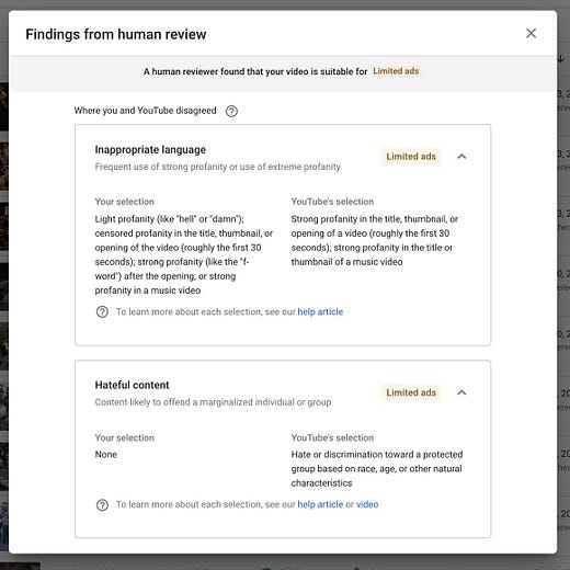 But I also think part of the issue is that supposed human reviewers are just not actually looking when they make decisions. Youtube claims their ratings about violence, language, and hate content are based on human review, following appeals of what they admit are automated demonetizations. For me, most of the reviewers just get it absolutely wrong. Protests against cops are labeled as hate speech.