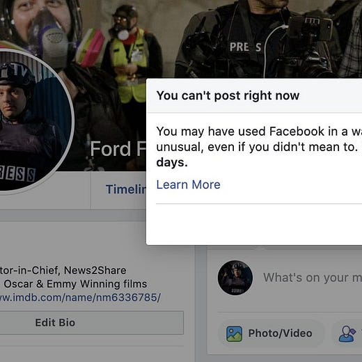 On November 1st, he was subject to a "complex entities interaction" ban after showing film of police arresting protesters. This prevented him from posting to groups.