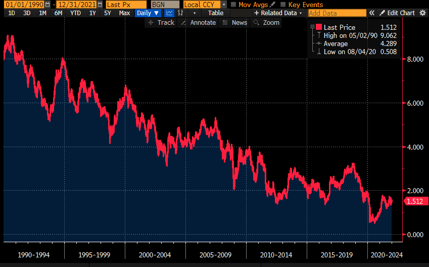 Meanwhile, the Chinese consistently manipulated their currency, subsidized industries and essentially broke many WTO rules while the United States looked the other way. The combination of cheap imports and stagnant wages in the U.S. dramatically lowered inflation. Lower inflation drove interest rates down substantially. Then when Wall Street had its subprime mortgage bubble burst in 2008 causing “The Great Recession,” we had a decade of Federal Reserve interest rates at or near zero. The chart below shows the yield on the 10-year U.S. Treasury Note from 1990 to 2021. We start at about 9% and end up lower than 2%.