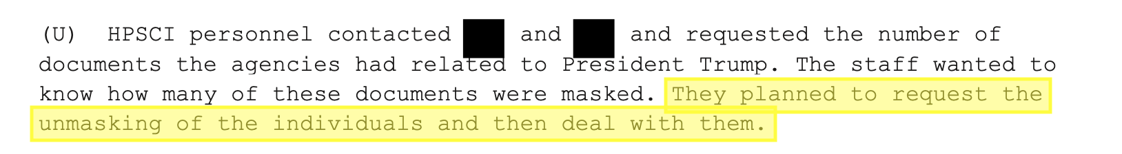 HPSCI personnel contacted [redacted] and [redacted] and requested the number of documents the agencies had related to President Trump. The staff wanted to know how many of these documents were masked. They planned to request the unmasking of the individuals and then deal with them.