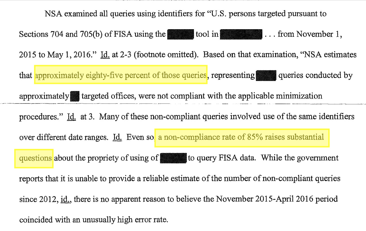 In 2016, before Trump or Hillary Clinton sewed up their respective party nominations, a bitter clash between intelligence agencies came to a head. An NSA compliance officer in early 2016 sent up an alert about an excess number of certain kinds of searches, including “To and From” queries (in which a user can enter, say, a phone number and receive results going to and from that number) and “About” searches (same, but the search will pull all results that involve a name, number, address, etc). The alert reached then-NSA chief Admiral Michael Rogers, who ordered an internal audit. The NSA in the summer of 2016 found a whopping 85% of all searches of this type were “non-compliant.” From a later FISA court report: