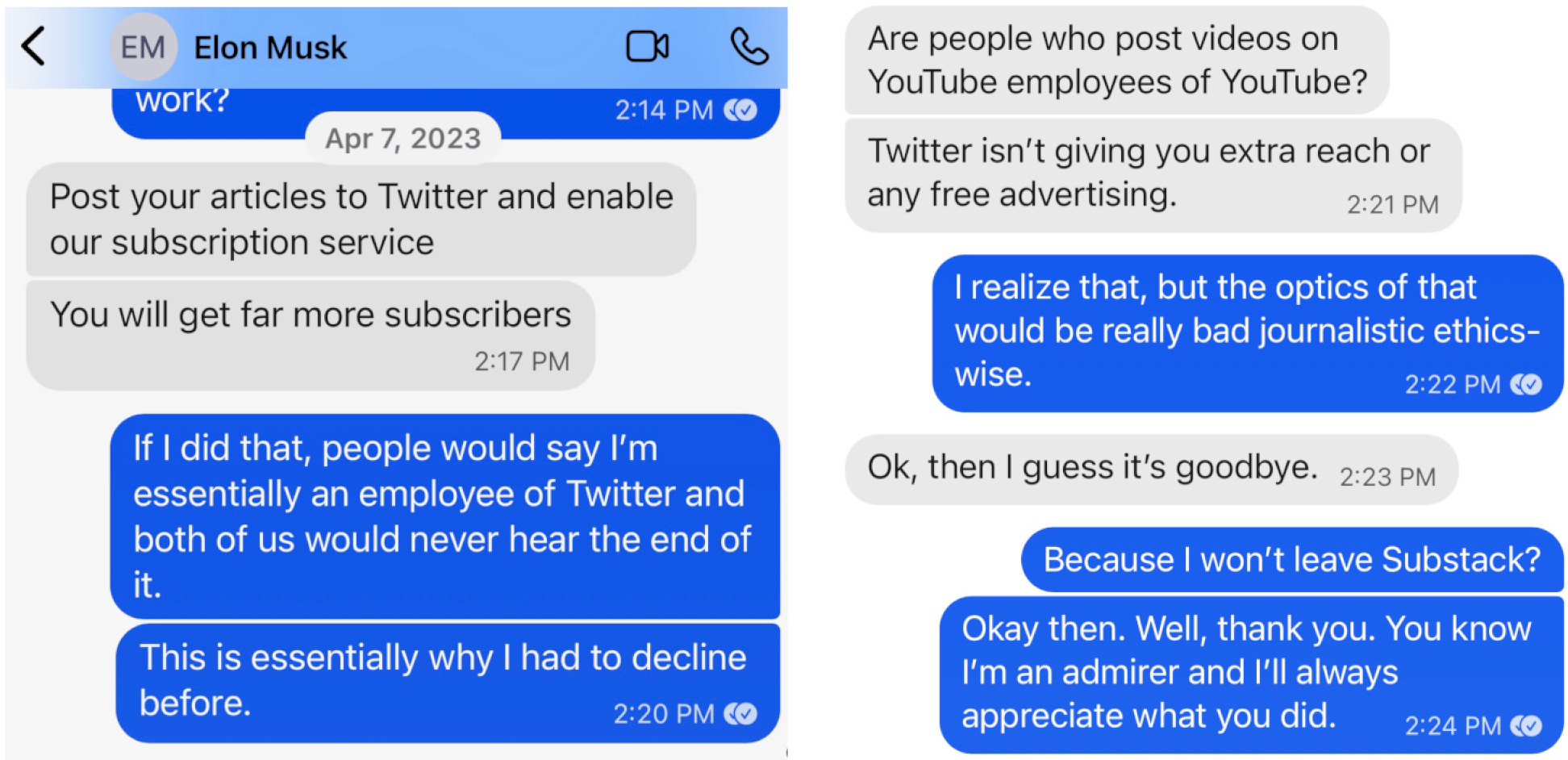 I would have done just about anything to keep working on the Twitter Files, but what Elon was asking — I still don’t think he understands this — would have looked like financial ties, which was enough undercut the reporting. I had no choice but to say no. When our exchanges were made public, these dynamics came out. Elon argued that if I moved to Twitter I’d “get far more subscribers,” but I still said no, because “people would essentially say I’m an employee of Twitter” and “both of us would never hear the end of it.” Also, the optics would be “really bad, journalistic ethics-wise.” Elon replied, “Then I guess it’s goodbye,” making clear I’d cut myself off:
