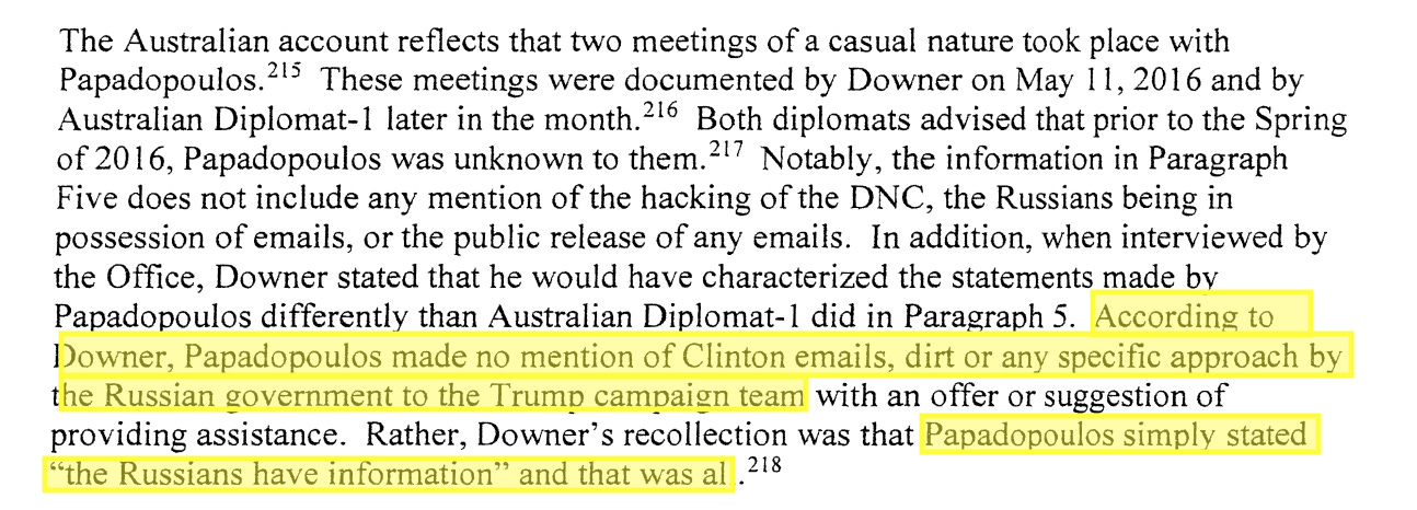 Obviously, you’re a former Journalism School Dean and I’m not, but I wouldn’t have thought you could win a Pulitzer Prize writing a lede with no attributions in which all the new facts are wrong. The assertion that the young Trump aide Papadopoulos spoke of “dirt” or “thousands of emails” was eventually blown up by Alexander Downer, the Australian diplomat mentioned. From the report by Special Counsel John Durham, who noted that Downer said in interviews there was “no mention” of these headline details, and that Papadopoulos simply said “the Russians have information”: