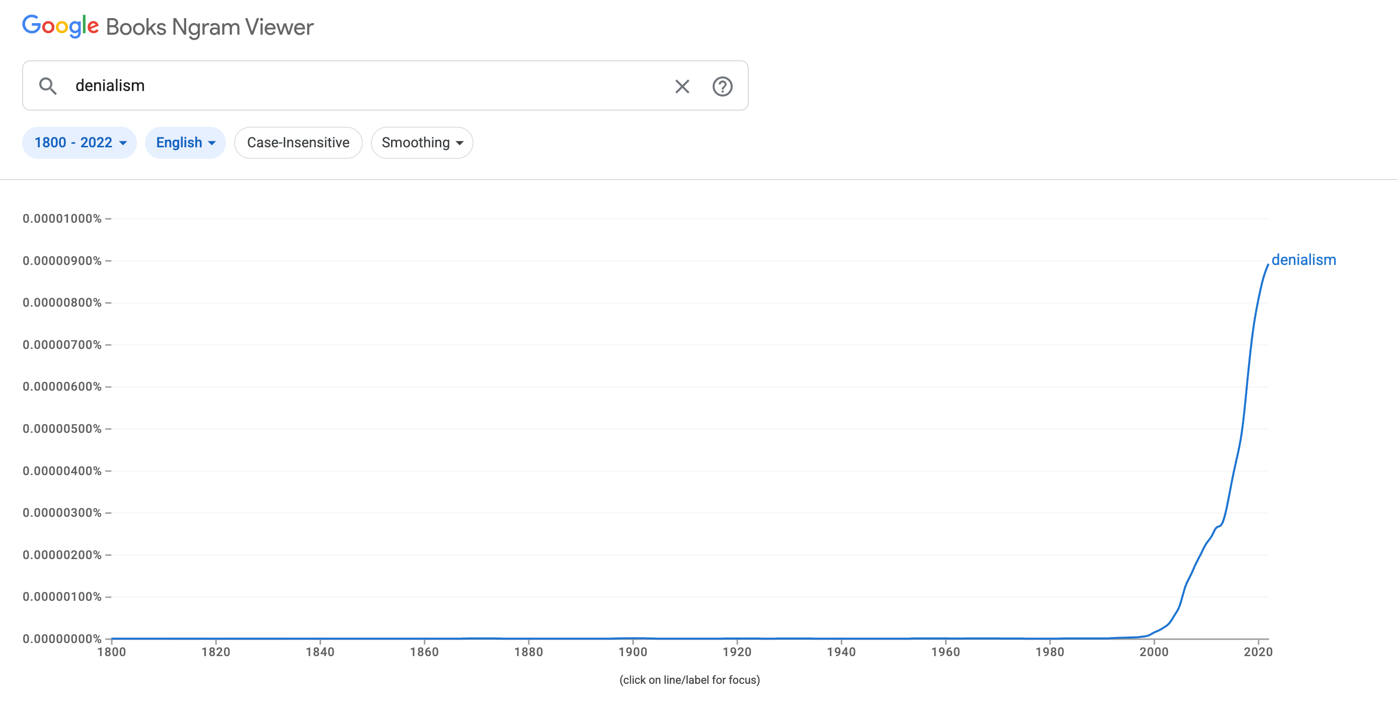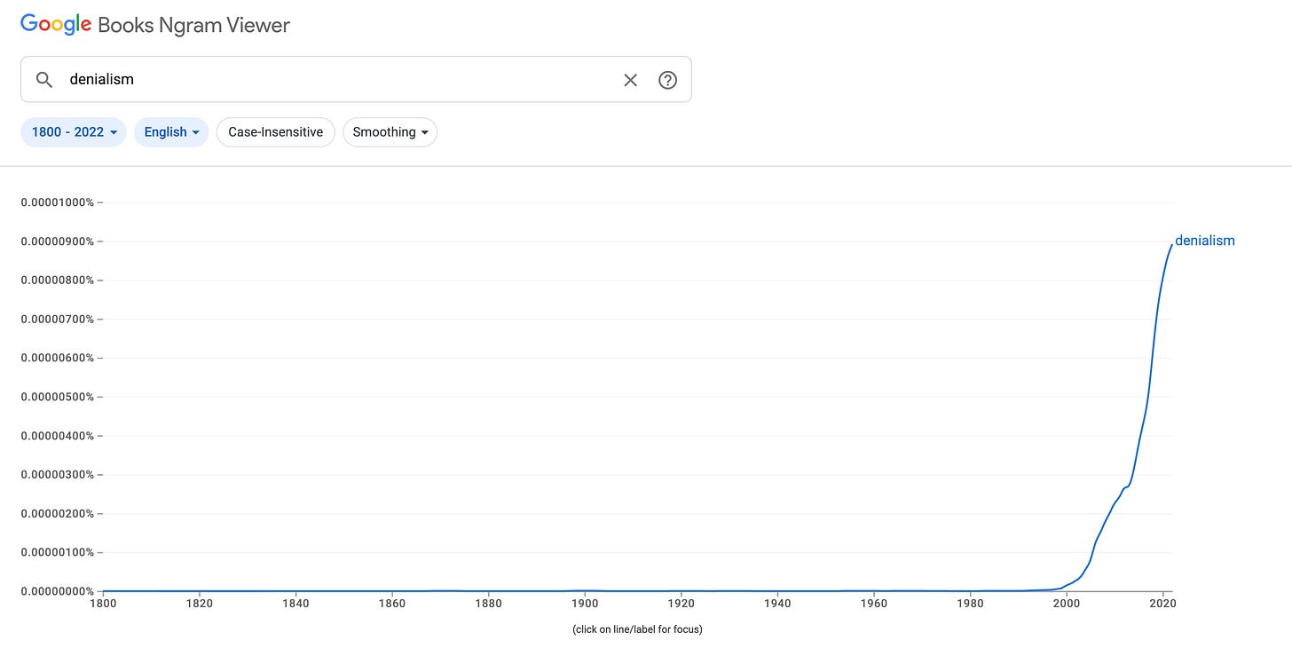 Denialism’s ascent was due almost entirely to the global warming issue. If you look at the graph above you’ll see a spike in the early 2000s, which appears related to a handful of books and articles, mostly about denial of the Holocaust. But the term really took off with the 2009 publication of Denialism: How Irrational Thinking Hinders Scientific Progress, Harms the Planet, and Threatens Our Lives, by New York Times author Michael Specter: