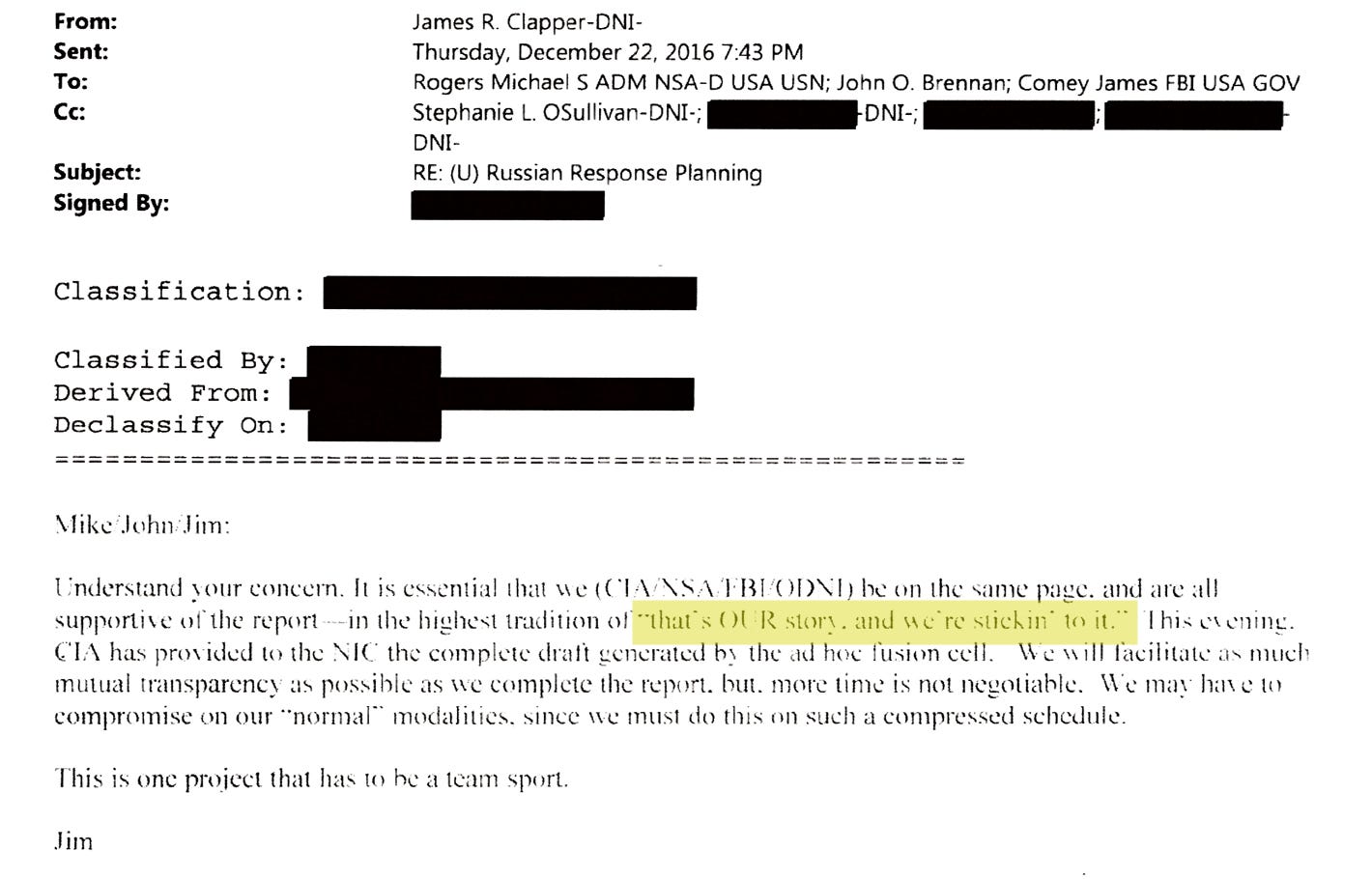 Clapper’s email was in response to a note about “concerns” from Rogers, the NSA chief who never upgraded his agency’s confidence level in the “Russia did it for Trump” conclusion from “moderate” to high. The Rogers letter makes it clear that the head of the Pentagon’s most powerful surveillance agency was being asked to sign off on a conclusion without seeing the most “sensitive” intelligence. From Rogers: