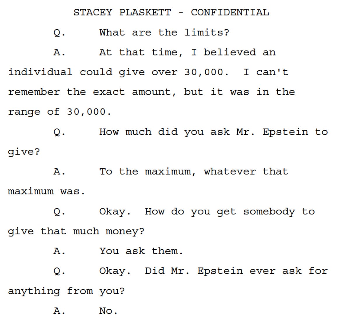 When asked what she did during a visit to Epstein’s home, she said she was raising money for the Democratic Congressional Campaign Committee at that time, and that the possibility that she asked for $250,000 “does not sound unreasonable.” She also suggested she’d received around $30,000 in donations from him, but that he never asked anything of her. Apparently, suggesting questions in televised hearings doesn’t count:
