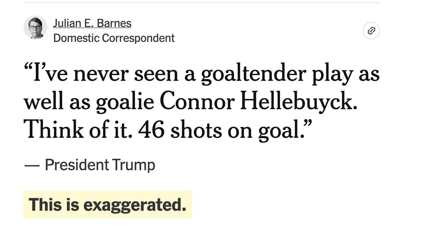 Trump is probably correct to say “I’ve never seen a goaltender play as well” because “sportswriters praised” Hellebuyck’s “amazing” game? What if “sportswriters” hadn’t praised it? It’s true Trump oversold the “shots on goal” Hellebuyck faced, but if you want to accurately be a dick about things, that’s the number Barnes should have corrected, not Hellebuyck’s saves. There’s petty, then there’s juking hockey stats during a presidential speech.