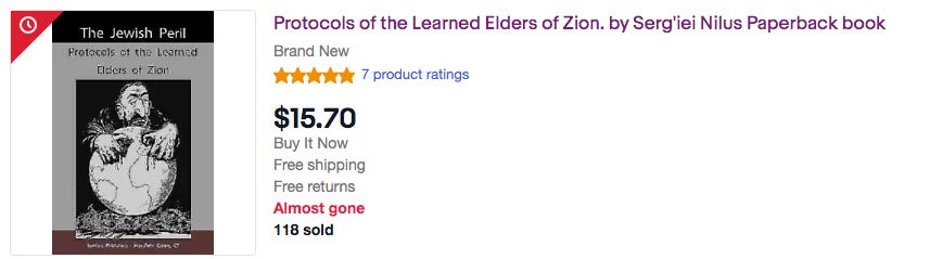 The Protocols of the Elders of Zion, $15.70. Learn all about the secret meetings Jews and Freemasons held in Basel in 1897, where they planned to conquer Christian civilization by unleashing the plague of socialism. If you think social problems have innocent explanations — like pandemics, for instance — this book tells you the real truth: