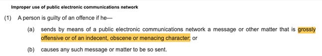 Police have several laws to choose from. There’s the UK’s Communications Act passed in 2003, which says: