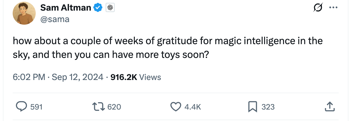 Cynically or delusionally, Altman ascribed quasi-religious significance to his product. When after rollout last September a customer pestered him about when to expect new voice features, Altman responded, “How about a couple of weeks of gratitude for magic intelligence in the sky, and then you can have more toys soon?”