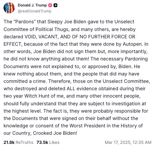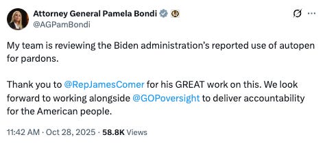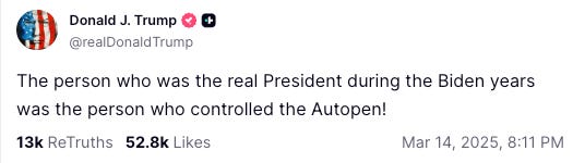 Trump writes a memo that directs his White House counsel to work with the Attorney General to investigate Biden’s use of the autopen. From the memo: