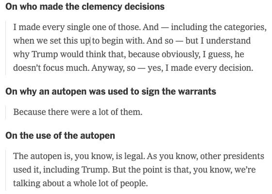 Biden defends his administration’s use of the autopen, telling the New York Times that “I made every decision” in regard to the pardons and commutations he made at the end of his term. The Times also posted excerpts of its 10-minute phone interview with him.
