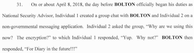 For the next 17 months, Bolton regularly sent “diary-like” entries to them about what he saw and heard that included classified information. From the indictment: