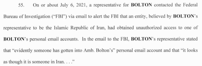 The indictment reveals that Bolton’s emails were hacked. A representative for Bolton notified the FBI and said that it was believed a representative of Iran was responsible.