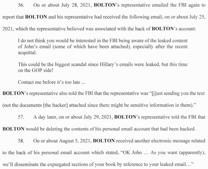 A representative for Bolton informs the FBI that both of them received an email from someone “associated with the hack of Bolton’s account,” according to the indictment. Another message was received on August 5, 2021