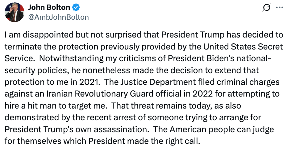 Trump cancels the Secret Service security detail that had been assigned to Bolton since late 2021 when the Justice Department learned that someone from Iran’s Islamic Revolutionary Guard tried to hire someone to kill him.
