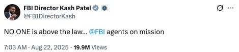 The FBI searches Bolton’s home in Bethesda, Md., and his office in Washington, D.C. The search began at about 7:00 a.m. At 7:03, FBI Director Kash Patel posts on X: