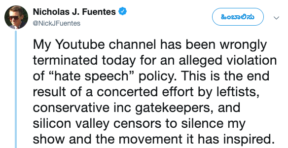 Fuentes announces on Twitter that YouTube terminated his channel.