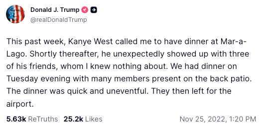 Fuentes has supper with Trump at Mar-a-Lago. The rapper Ye, formerly Kanye West, brought Fuentes as a guest. Trump posts on social media that it was a surprise when West brought guests.