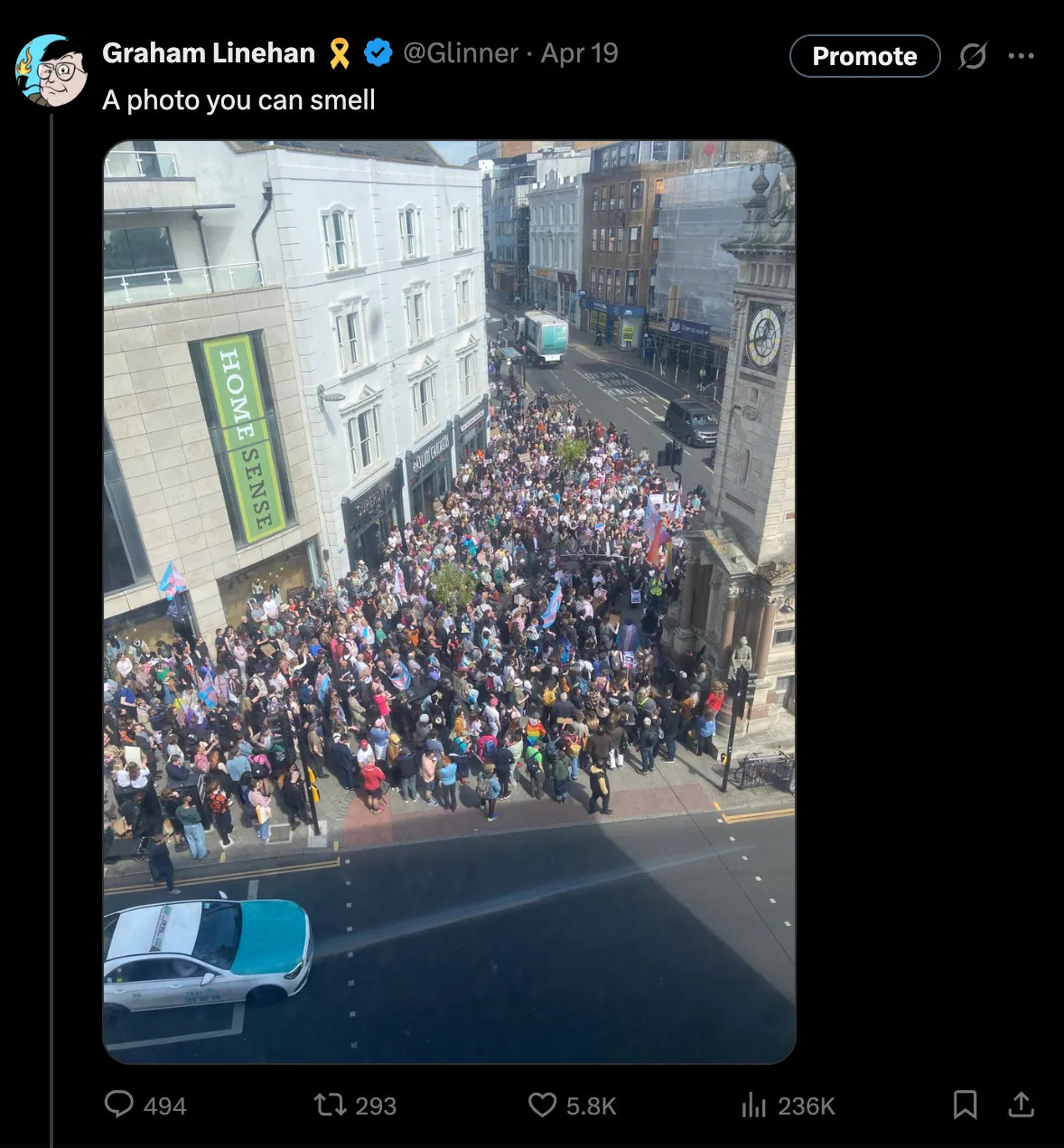 But on Monday while returning to Heathrow Airport from the United States, Graham was arrested on the basis of a 1986 law. I believe it was the Public Safety Act; I’m not sure. It’s the public something act. But these are the three tweets that got him arrested. The top one is a picture of a trans protest and it just says, “A photo you can smell.” The next one-