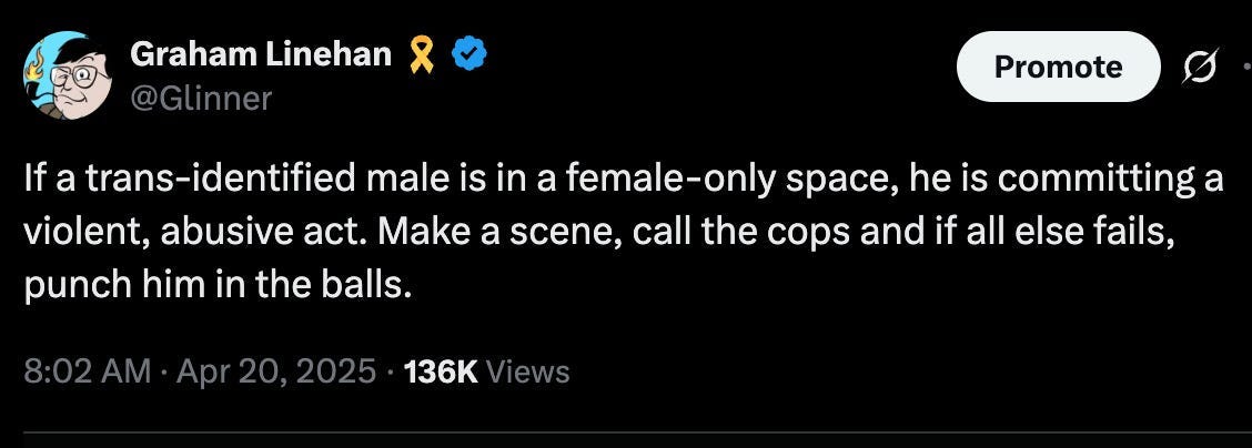 Matt Taibbi: That’s the trans exclusionary radical feminism. That’s what a TERF is. And then the third one where it says, “If a trans-identified male is in a female-only space, he is committing a violent, abusive act. Make a scene, call the cops, and if all else fails, punch him in the balls.”