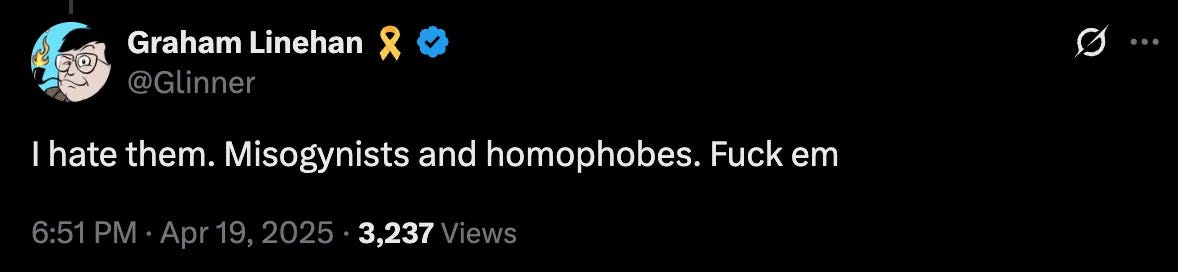 Matt Taibbi: No, no, no. Oh, misogynists and homophobes? Generally, yes, but he’s calling trans activists misogynists and homophobes, so therefore we’re not supposed to hate them.